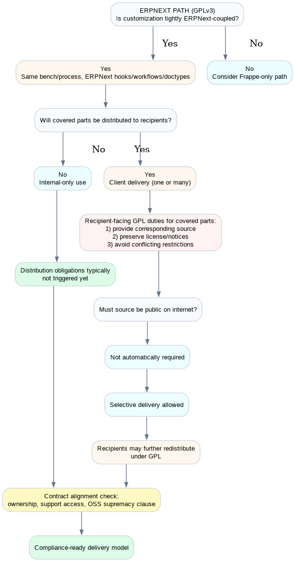 Before each client handover, attach: 1. Module classification sheet (Frappe-path / ERPNext-path / mixed) 2. Covered-component inventory 3. Corresponding Source index 4. License/notice bundle 5. Delivery method declaration (how §6 is satisfied) 6. Contract-compatibility check note